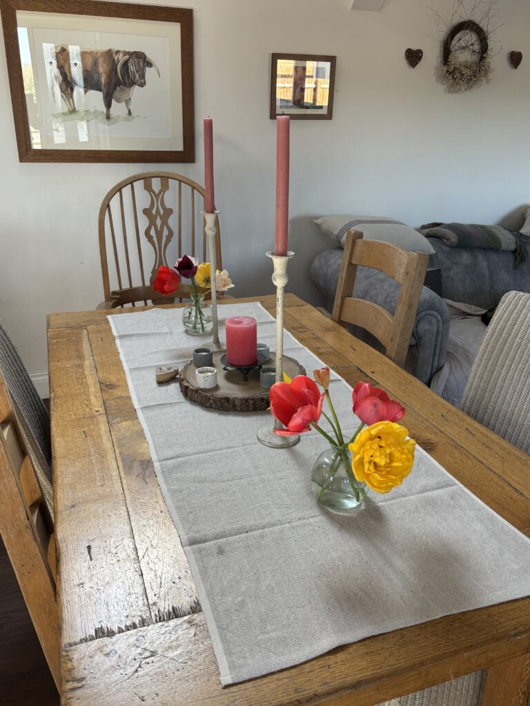 At the moment I’m sat at my kitchen table with vases of tulips, the door open and the sun pouring in. It’s one of those Spring days that catches you by surprise after Winter -but very much needed.