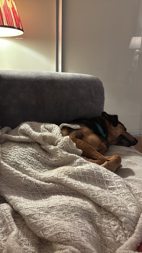 I found a blanket that I bought in France in 2016, on my first holiday after my divorce, it’s been with me through a lot – cosy nights on the sofa, yoga retreats, tug of war with the dog. This time I knew it was ready to go.