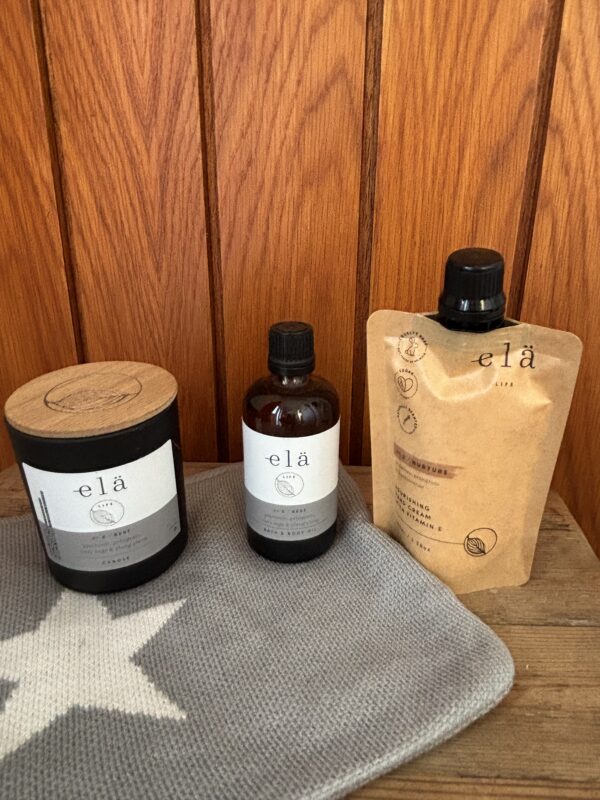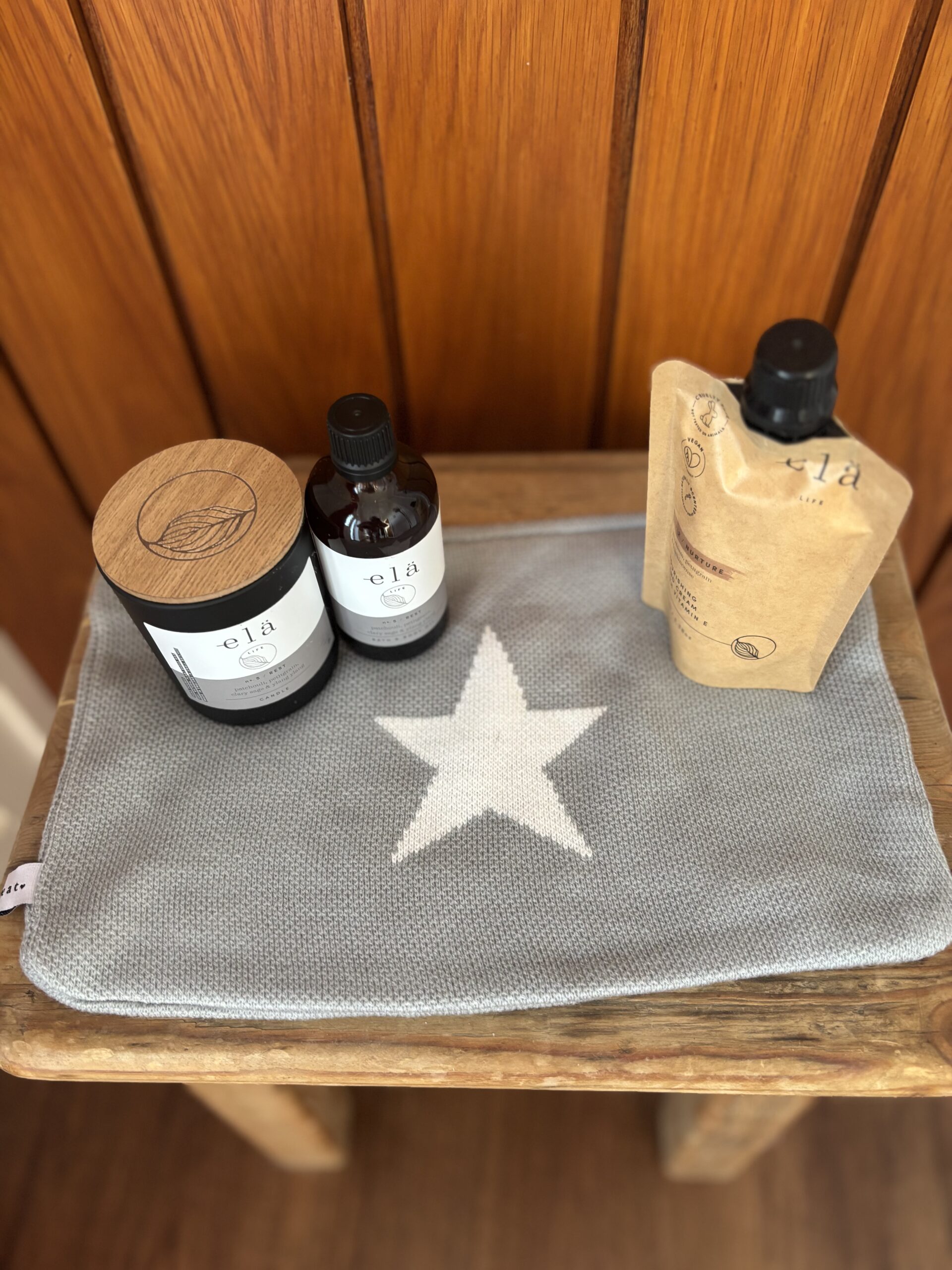 A small wellbeing set for quiet evenings — a spa-scented candle, bath oil and hand cream from a brand I loved (now no longer trading), paired with a washbag.