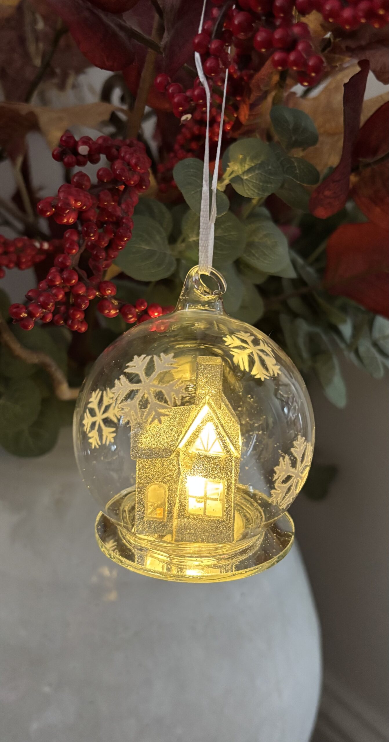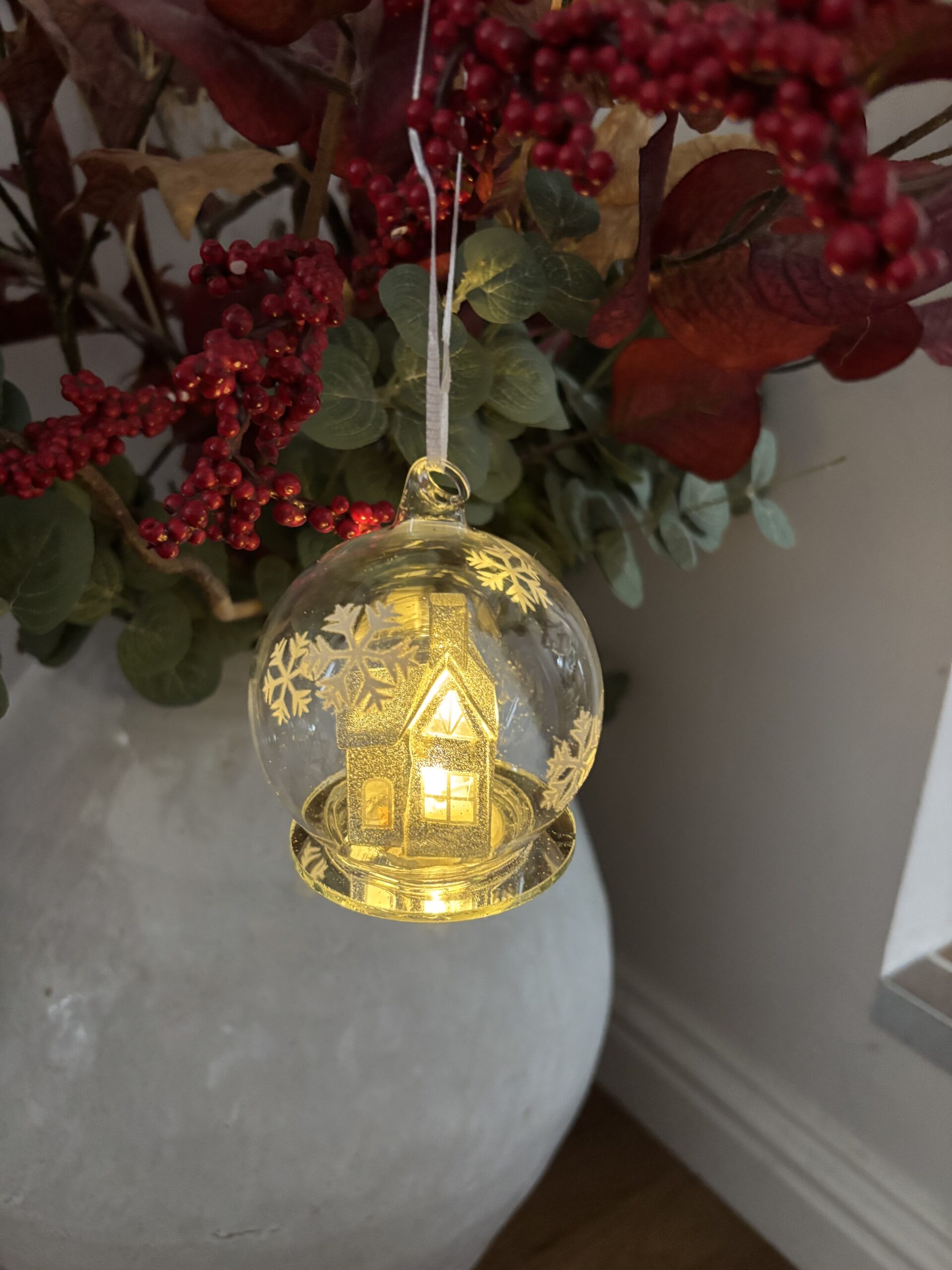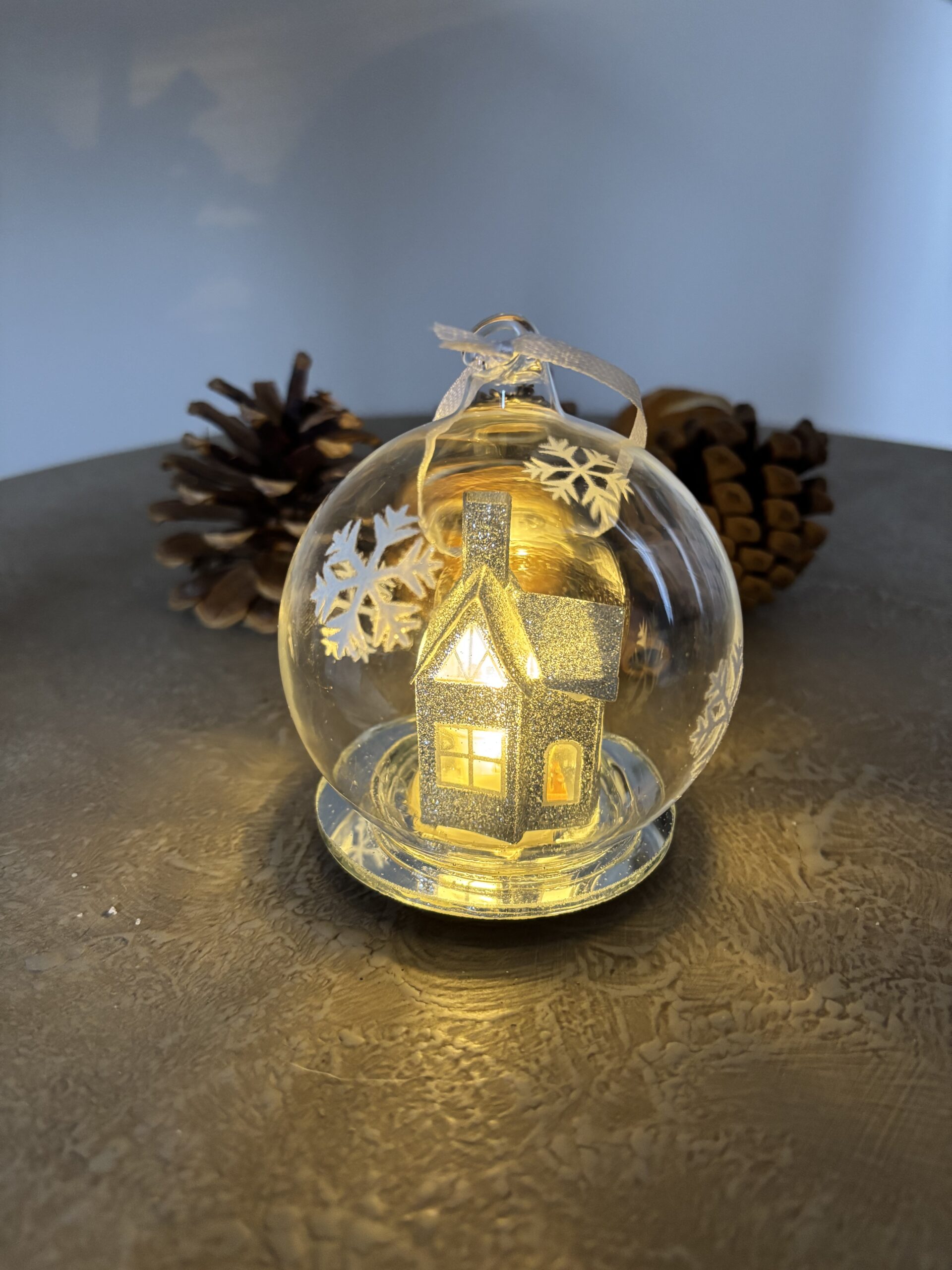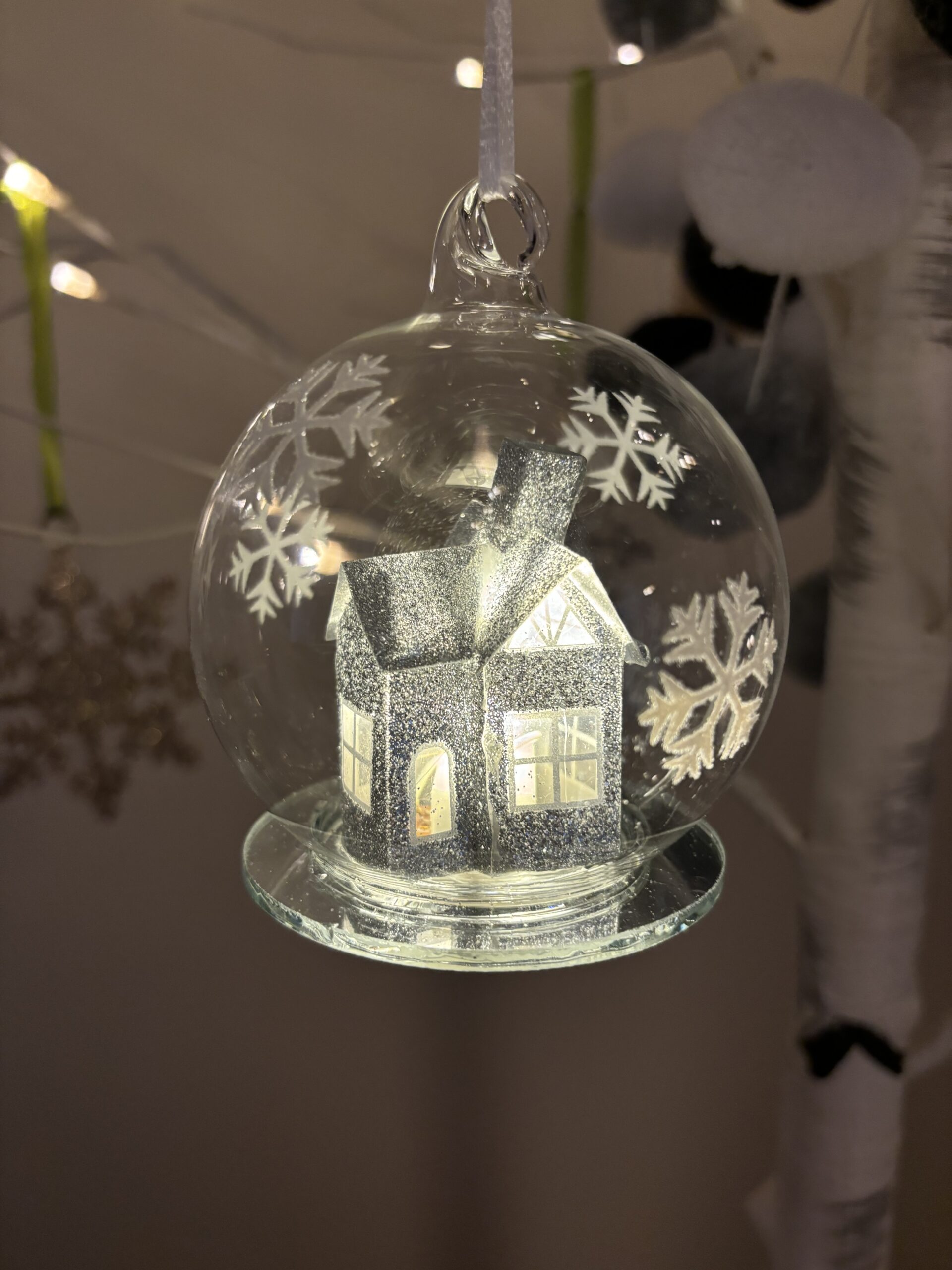 A silvery glitter house inside a snowflake globe, the house lights up (replaceable batteries. Can be hung on a tree or placed on a table – note these are glass.